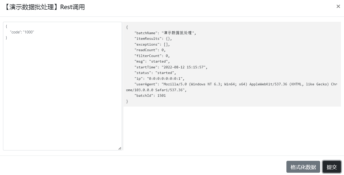 可通过【REST调用】功能,进行快速触发当前数据批处理,如果设置的是同步执行,提交触发后将处理结果返回,返回信息包含执行状态等信息。