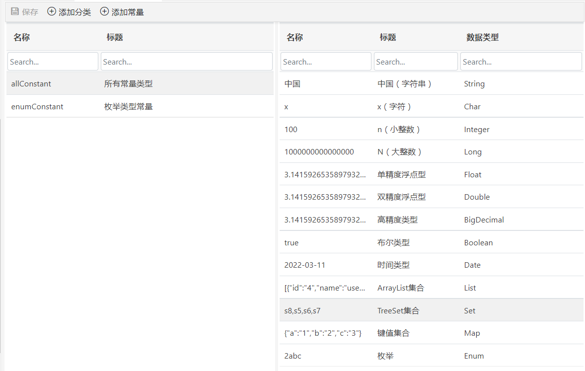 (1)在excel中作如下定义,注意sheet页名称是常量的分类名,表格列依次是名称、标题、数据类型