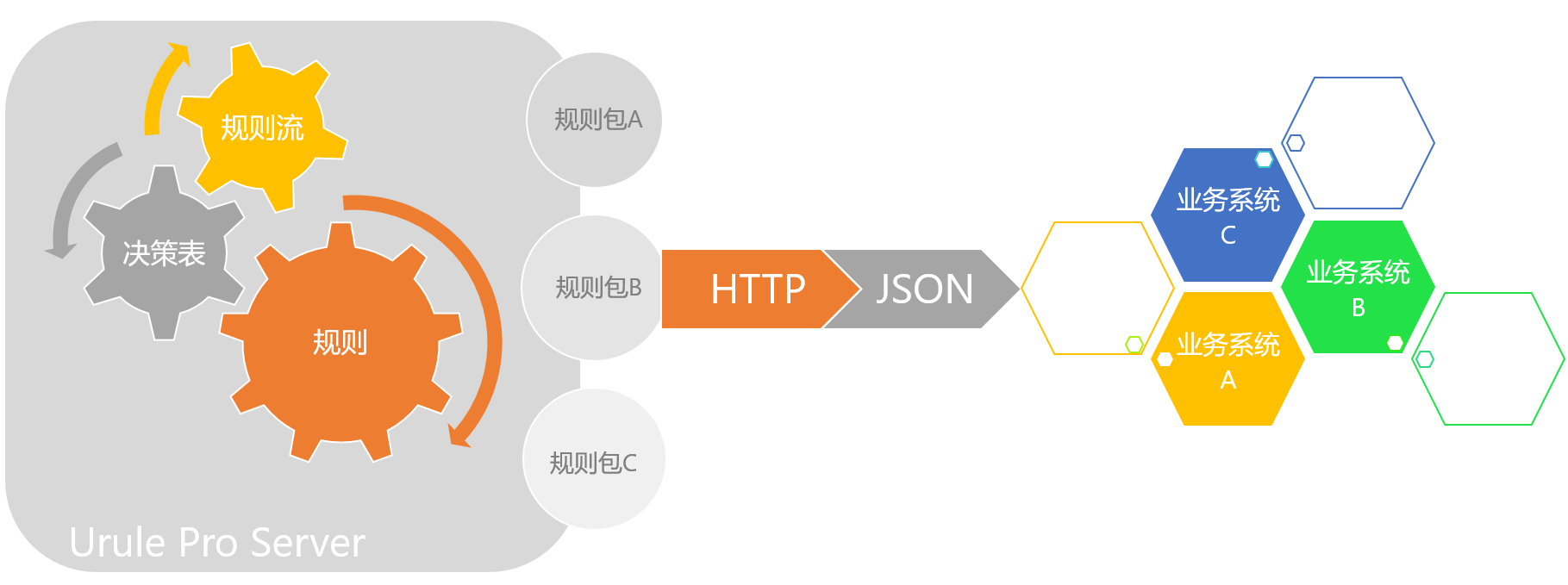 在客户端服务器模式下,包含URule Pro Console模块的应用被部署成一个独立的Server,在这个Server上创建规则项目,在项目中根据业务需求添加决策集、决策表、交叉决策表、决策树、评分卡、复杂评分卡、决策流等,再把这些文件打包到知识包中,最后通过HTTP协议暴露给各个客户端业务系统使用。
