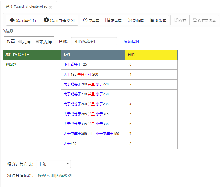 普通评分卡是URule Pro当中专门为简单评分系统而设计的一种业务规则工具,它可以针对某个实体对象的属性条件进行评分,每个属性在条件满足后还可以添加权重支持,同时对于得分的计算方式提供求和、加权求和以及用户自定义方式,以最大限度满足业务系统评分规则的需要。