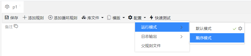 可以看到,在默认模式下,对于存在大量相互依赖的向导式规则来说,上述两种方式用起来还是很麻烦的。要想用一种简单且容易理解的方式实现上述功能,可以规则运行模式由默认模式改为顺序模式。 通过向导式规则集的工具栏配置菜单按钮下的运行模式菜单项,即可实现将默认模式修改为顺序模式,如下图所示: