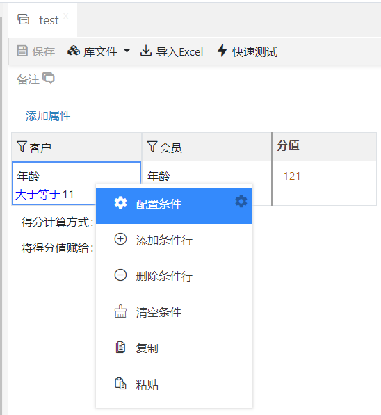 在评分卡条件配置过程中,如果条件类似,可点击右键菜单将条件单元格里条件复制下来,然后在目标条件单元格选择右键菜单里粘贴即可快速将目标条件粘贴到当前单元格中,可实现条件的快速配置。