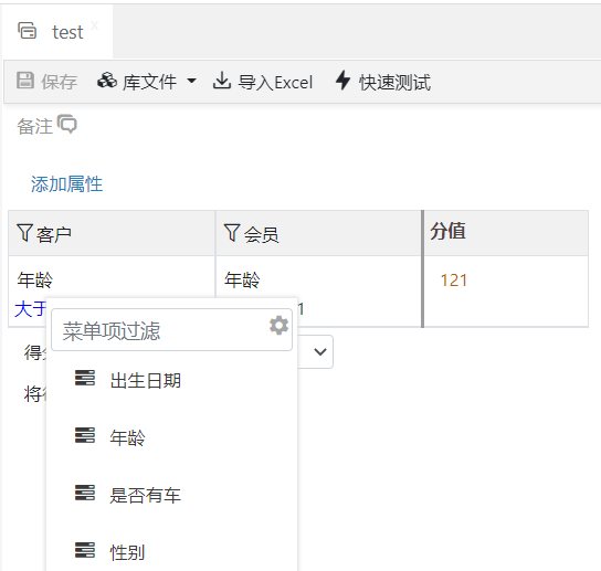 如上图中红色圆圈内分值为6的单元格所对应的条件就是会员对象的年龄属性要大于或等于30并且小于50,同时订单的数量属性要小于10,这样才会等到6分的分值。