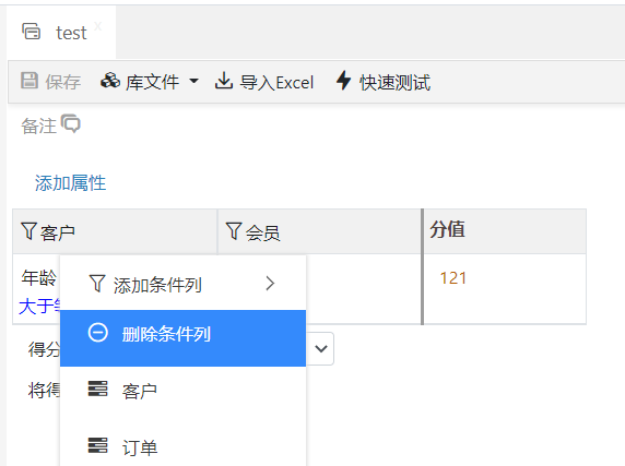 和普通评分卡不同的地方在于,复杂评分卡的条件列可以有多列,可以在条件列列头上点击右键菜单,通过”插入条件列“项来增加条件列,对于每个条件列都可以选择不同的对象与之绑定,每个条件列下条件单元格中又可以选择对应的对象属性,再配置相关的条件,这样每个分值的条件计算就可以形成多条件叠加效果,从而大大增加评分卡定义的灵活性,充分满足业务需求。