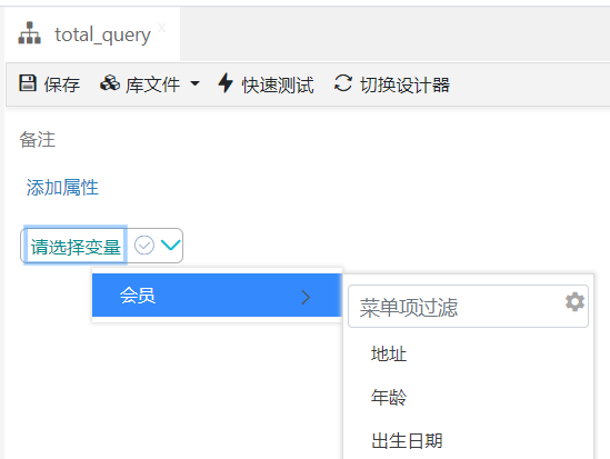 变量节点就是用来选择目标变量的节点,要操作这里我们需要首先导入需要使用到的变量库文件或参数库文件,比如导入我们定义的会员变量库,然后就可以选择具体的会员变量属性,如下图:
