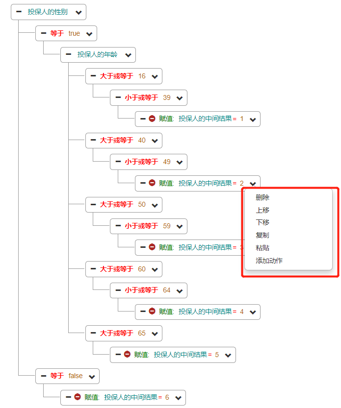 可以看到,相比“横向树设计器”,这种传统类型树设计器节点菜单内容更多,对树的编辑能力更强,因为它采用的是传统的树形结构展示,所以这种“纵向树设计器”有非常强大的树表现能力,可以快速展示成千上万个节点。 你在定义决策树时,如果节点数量过多,采用“横向树设计器”会发现其加载速度很慢,但切换到“纵向树设计器”则不存在这种问题。 同时大家也能看到“纵向树设计器”这种传统的树结构相比“横向树设计器”对树的表现能力略差一些,具体使用中大家可以根据情况灵活选择。